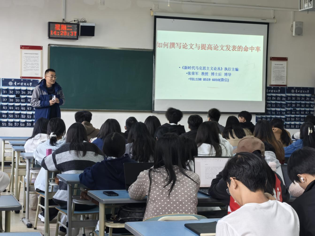 讲座中,张荣军教授结合自身丰富的学术经验和编辑工作实践,系统阐述了学术论文的写作规范、研究方法与创新路径,并针对论文选题、文献梳理、论证逻辑及投稿策略等关键环节进行了细致讲解,为同学们提升科研素养与写作能力提供了切实指导。